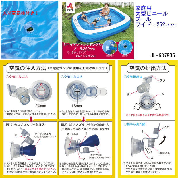 空気注入には電動ポンプのご使用をおすすめします 商品名: JILOng ジャイアントレクタングルプール 262cm×175cm 品番: JL-687935 サイズ: 膨らんだ状態:約)長さ262cm、横幅175cm、高さ50cm、 仕様: 水の使用量の目安は約495Lです。