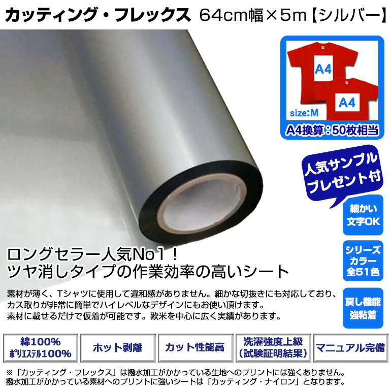 アイロンプリントシート カッティング・フレックス 64cm幅×5m 【シルバー】 銀 メタリック アイロン カッティングシート アイロンシート ラバーシート シルエットカメオ カッティングマシン 艶消し/つや消し 綿/ポリエステル 洗濯強い DIYユニフォーム【プレゼント付!】